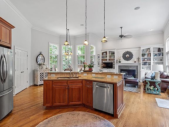 With numerous architectural details throughout, this custom 4 bed, 3.5 bath home is truly incredible. The kitchen features custom cherry wood cabinets w/ golden leaf granite countertops, a raised island bar top, & large pantry. Stainless appliances, including double oven, under-mount sink & one of a kind tumbled marble backsplash. Family rm. has custom bookcases & gas-log fireplace. Sep. dining rm. and living rm. 1st floor master has tray ceilings & accent lighting. Master bath includes custom cherry cabinets, marble countertop, custom-fit whirlpool tub w/ dedicated water heater, oversized plate glass mirror & separate shower w/ dual shower heads. The master closet is to die for with custom-fit shelving & mirrored seating area. Two additional guestrooms are located on the 1st floor. The guest baths all featured dual vanities. 3 1/4 white oak plank floors throughout the main floor. The 2nd floor includes a 4th bedroom, large bonus rm. & 2,000+ sq. ft. of storage space!! Conveniently located to 540, I-40, RTP, & RDU. Large stone patio is a perfect place to relax. This home has too many incredible features to list!