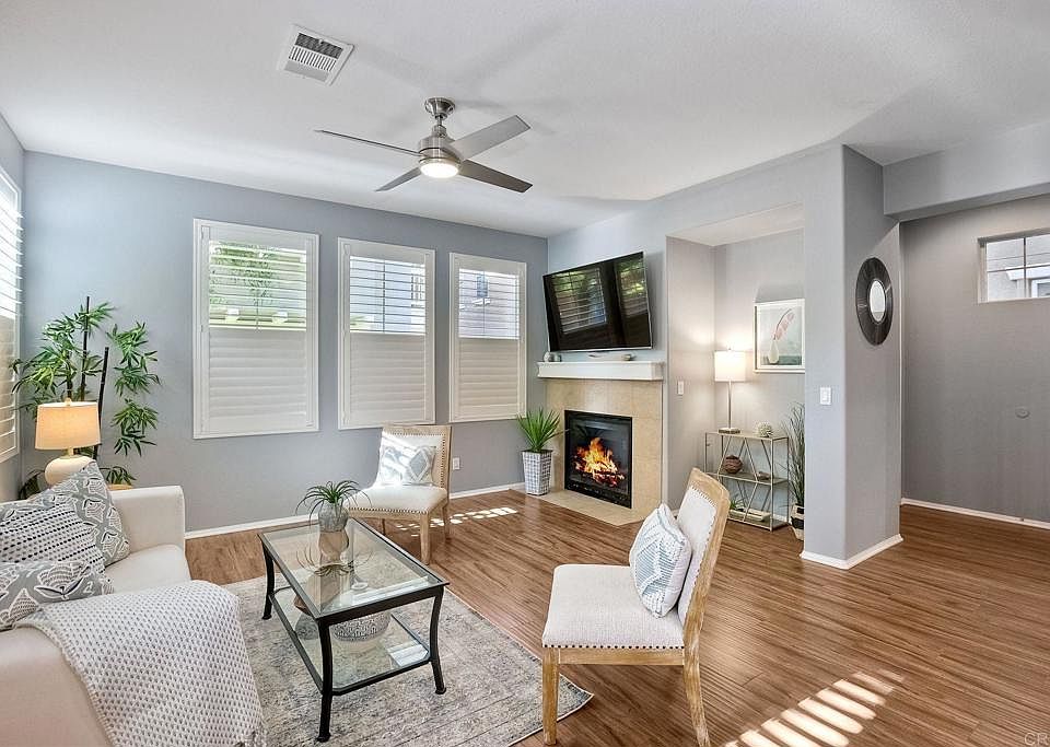Beautiful, natural bright light and spacious Otay Ranch Home (largest floorplan) in the gorgeous tree lined neighborhood known as Tapestry. Granite kitchen counters, freshly painted interior, white cabinets, breakfast bar, engineered oakwood flooring and large living room with cozy fireplace. This home has all the updates you will appreciate - newer stainless steel appliances including refrigerator, washer & dryer, central air and heating, tankless water heater, double pane windows, custom shutters, ceiling fans throughout, double sinks, large built-in linen cabinets upstairs, and a laundry room upstairs! Two car garage with extra overhead storage enough for all your needs! Dining room opens to outdoors where you can garden, barbeque and enjoy the Southern California sunshine. Four spacious bedrooms including an extra-large master suite & additional third floor bedroom with ensuite bathroom! Lovely lot with charm & its own gated courtyard! At Tapestry Mosaic you can enjoy resident access to resort-like amenities such as a fully equipped exercise room, clubhouse, pool, spa, poolside barbecue, and children's playground. Experience all that Otay Ranch has to offer. This community is close to trails for hiking, cycling and running, state of the art parks with sports courts, award-winning schools. Minutes from the charming shops & restaurants at Otay Ranch Town Center.