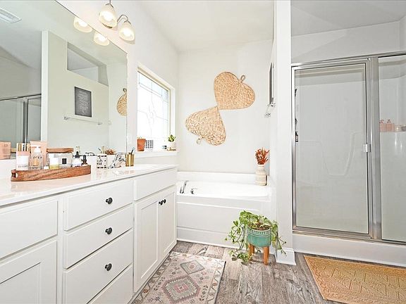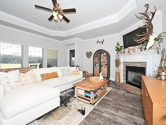 **Beautiful & Convenient**describes this home. It has 4 bedrooms / 3 full baths, with one bath attached to a bedroom, which makes for a great guest /in-law suite. Enjoy the cool nights with gas logs in your open concept main living area with trey ceilings in the living room area as well as the primary bedroom. It has beautiful white cabinets, white subway tile backsplash as well as granite counters. You'll love the stainless steel appliances and corner pantry in this open kitchen. Home has crown molding throughout, cultured marble bath counters, custom built-in shelving in primary closet as well as laundry room & an epoxy covered garage floors for easy cleanup. Enjoy your wood privacy fenced in back yard from your covered back porch. Call & set your showing appt. today.