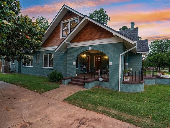 Welcome to 1828 South 7th Street in Chickasha—a beautifully reimagined home that blends timeless charm with modern luxury. This fully remodeled 3-bedroom, 2-living room home with a bonus room sits on a spacious corner lot and offers over 3,000 square feet of living space. Nearly everything has been replaced, including the roof, HVAC, electrical, plumbing, and all-new energy-efficient windows. The original hardwood floors have been preserved, adding warmth and character, while the rest of the home has been completely redone with custom finishes throughout. The open-concept kitchen is a true showpiece, featuring quartz countertops, designer cabinetry, stainless appliances, a gas range island, and a striking brick backsplash crafted from the home’s original fireplace. The kitchen shelves are made from reclaimed 1930s rail cart flooring, and the black wood accents in the bathroom were repurposed from the original wall lath. Both bathrooms have been fully redesigned with upscale vanities, premium tile, and modern fixtures. The layout includes two spacious living areas and a bonus room perfect for a playroom, office, or potential fourth bedroom. Behind two built-in bookcases, you’ll find one hidden storage area and one discreet IT closet—clever, functional touches that make this home truly unique. A full unfinished cellar offers additional space for storage or storm shelter. Local lore says the original owner—a doctor—crafted moonshine in the basement and concealed it behind a false wall in the upstairs closet. The detached garage apartment once housed WWII soldiers stationed from Lawton, adding even more historical charm. Outside, the detached two-car garage and extended driveway provide ample parking, and the expansive fenced yard offers privacy and potential. The front porch, with its arched entry and swing chairs, is the perfect place to unwind.