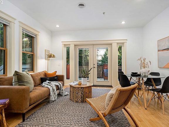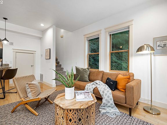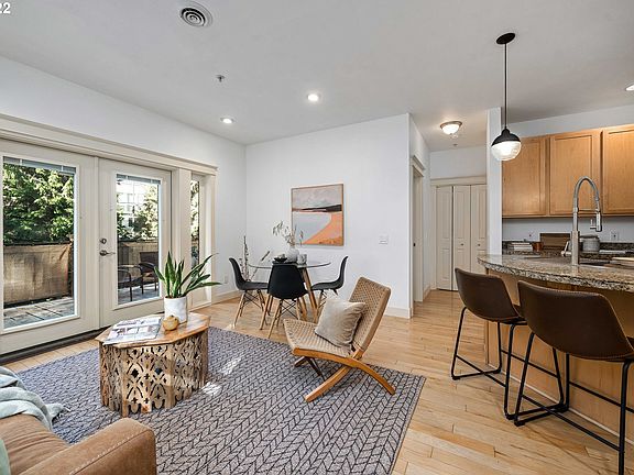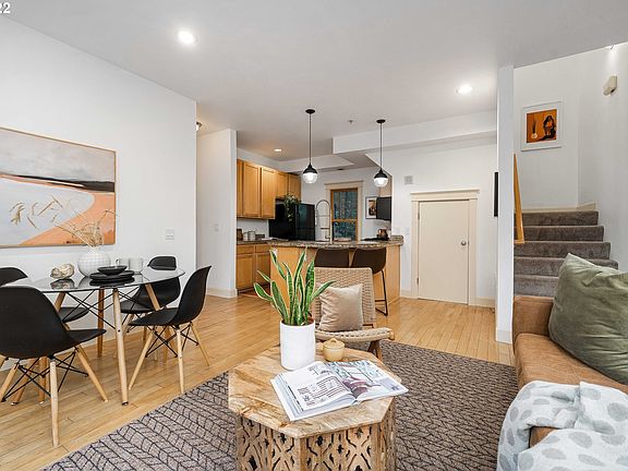 Tall ceilings, natural light, and open floor plan in this beautifully kept condo that lives like a townhome. Private balcony, attached garage with room for car and additional storage, brand new carpet and interior paint make this end-unit move in ready! Located on a quiet, dead end street next to PSU walking trail, downtown, NW 23rd, and easy freeway access to Nike and Intel! All appliances staying including IN-unit washer and dryer.
