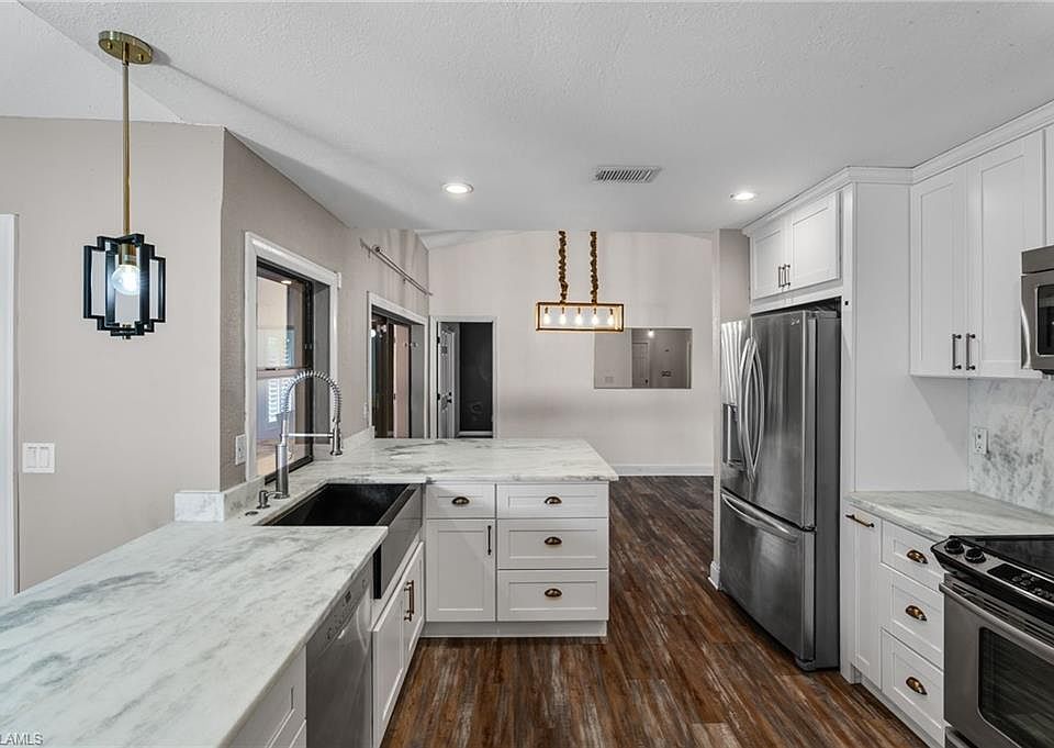 SWIM SPA – ENCLOSED LANAI – REMODELED HOME! This beautifully updated 4-bedroom, 2-bathroom home in Southwest Cape Coral combines style, comfort, and function, featuring a transformative swim spa, large enclosed lanai, and high-end stained knotty wood–accented ceilings. With 2,196 square feet of living space and a spacious fenced yard, there’s plenty of room for entertaining, relaxing, or enjoying outdoor activities. Step inside to find a thoughtfully remodeled interior that includes a totally updated kitchen with shaker-style cabinets, quartz countertops and backsplash, new stainless steel appliances, and a pass-through window to the lanai—perfect for gatherings and family meals. The primary bathroom is beautifully designed and wheelchair accessible, featuring a large tiled shower with a built-in seat. Gorgeous luxury vinyl plank, tile, and wood flooring run throughout the home, enhancing its warm, modern appeal. The swim spa turns your backyard into a private oasis—ideal for both relaxation and fitness, offering the benefits of a pool and a hot tub in one. With a massive enclosed lanai, this home is built for year-round Florida living. Located in the desirable Southwest Cape Coral community, you’ll enjoy easy access to shopping, dining, parks, marinas, and top-rated schools, all just minutes away. Known for its beautiful canals, peaceful neighborhoods, and growing local amenities, this area offers the perfect balance of convenience and coastal charm. Best of all, this home was not affected by Hurricane Ian and had no flooding or wind damage. Schedule your showing today and experience the best of Southwest Cape Coral living! THIS PROPERTY QUALIFIES FOR A 1% LENDER INCENTIVE IF USING PREFERRED LENDER, INQUIRE FOR MORE DETAILS** Renderings that showcase furniture have been virtually staged