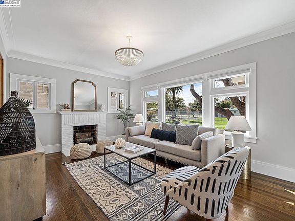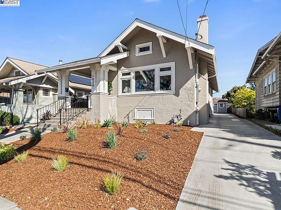 Built in 1921, this thoughtfully updated vintage home has been reimagined for a 21st century lifestyle with modern finishes and conveniences blended with original Craftsman architectural details. Situated on a large lot with a backyard designed for outdoor living and entertaining, this single-level home features 3 bedrooms, 2 full bathrooms, a spacious kitchen, formal living and dining rooms, a basement and large studio/shed for additional storage needs. Fresh interior paint and new light fixtures throughout, dual-pane windows, and completely updated kitchen + bathrooms. Original features include coved ceilings, Craftsman moulding/trim, a brick fireplace, oak floors with rosewood borders + a dining room with bay windows, a built-in sideboard/china cabinet and a coffered ceiling. Fabulous landscaped backyard with paver walkways/patios/a pergola. Newer roof (2021). Plenty of room for off-street tandem parking. Situated across from McKinley Park's playgrounds, courts and Rec Center amenities! Located less than 1/2 mile to both Nob Hill Foods and the heart of downtown Park St, and just minutes to the South Shore Center, I-880 and BART. The best of vintage and modern is here in this special home! Move right in!