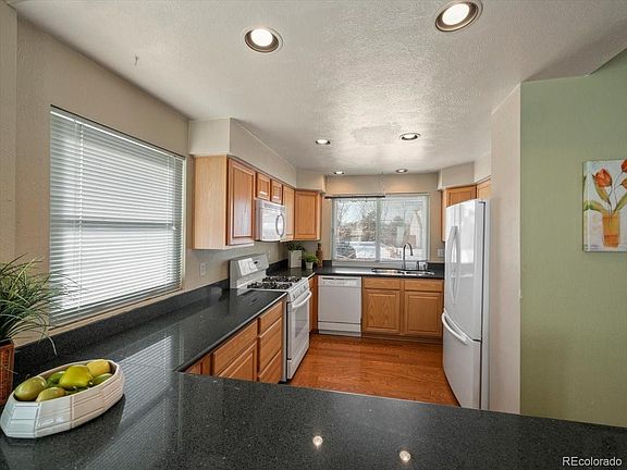 Lovely tri-level home in an amazing neighborhood! Walking in through the front door, you are greeted by a uniquely designed open floor plan with vaulted ceilings and large windows that let in lots of natural light. All the widows except the french door and sidelight to the front door are all triple pane windows. To your right, you will find the spacious kitchen with tons of cabinet space, Silestone counters and hardwood floors. A bar-top row of cabinets separate the kitchen from the dining room and then flows seamlessly into the living room, which features a wood burning fireplace. From here, you have access to the spacious back patio and well kept back yard featuring a raised and enclosed garden bed. From the living room, walk down four steps into an open flex space. On this level, you will find a full bathroom and a bedroom. Take the fight of 9 steps down from here into the partially finished basement with lots of potential, where you will also find the laundry area. The upper floor features the primary bedroom with a ceiling fan and corner windows, a beautifully remodeled 3/4 bathroom with quartz counters and glass enclosed walk-in shower, and one more bedroom. Other key features include a 2 car attached garage that has an attic space that is floored for additional storage and a covered front porch with an extended deck. This gem backs to Arrowhead Park and is part of the Smoky Hill HOA that includes great amenities including a pool, club house and tennis courts for only $66 a year! Plus it is only a 6 minute drive to Quincy Reservoir where you can enjoy walking trails, biking, fishing, grilling and non-motorized boating. Located within walking distance to Trails West Elementary School and only a 4 minute drive to grocery stores and restaurants, this is the perfect place to call home!