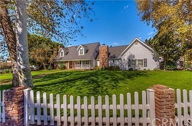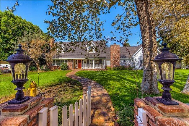 A lovely custom home that feels like its right out of the movies! Situated on a large corner lot offering lots of possibilities such as a circular driveway this oversized lot has endless charm. Inviting front porch is at the end of a winding brick walkway behind a white picket fence. Enter into a formal foyer overlooking a formal living room with fireplace. Large formal dining room with windows overlooking the mature landscaping featuring trees and roses. The custom kitchen featuring high end appliances, large center island, granite, and office niche, and custom flooring. The huge family room with soaring two story ceiling has a fireplace and wet bar the perfect place to entertain and open to the kitchen. Downstairs bedroom could be second master. Second staircase off of family room offers an upstairs bedroom and bathroom perfect for in-laws, guests, or teenage kids. Main staircase leads to the master bedroom with walk in closet and additional custom built-in storage. Two additional bedrooms are also on this floor. All 3 bathrooms are custom and feature high end stone work. Backyard offers gorgeous pool and spa with fountain and outdoor kitchen. Motor court with electric gate has room for additional guest house or more garages and RV storage. Currently has 3 outside buildings that are used for craft room, gym, and storage with plenty of room for more. This is a one of a kind house on a one of a kind lot. Truly a warm and lovely home with lots of privacy.