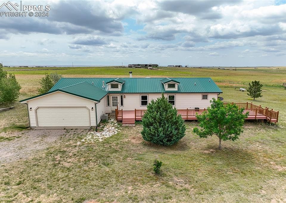 Experience incredible country living on this expansive 41+ acre lot (Zoned A-35), fully fenced + cross-fenced, offering breathtaking 360-degree views of Pikes Peak, Mountain Range + beautiful meadows. This private country oasis, perfect for you and your animals, feels like a secluded retreat while being just 15 minutes from shopping, dining + entertainment & Approx 30 min to COS Airport, downtown + hospitals. Upon entry, you're welcomed by an expansive 50x12 composite deck with stunning views of Pikes Peak. Inside, the bright and open floorplan features vaulted ceiling, walls of windows + a spacious GreatRoom centered around an adobe-style wood-burning fireplace. The kitchen opens to GreatRm + Dining Rm and boasts soaring ceilings, breakfast bar seating + includes all appliances. The full bathroom, with tile floors, serves guests as well as the generously sized 2nd and 3rd bedrooms. The owner’s suite features vaulted ceilings, walls of windows, a dressing/sitting area, a large closet, and an ensuite with tile floors, a standalone shower, dual sinks, and more stunning views of Pikes Peak. The large mudroom/laundry room offers ample cabinetry and counter space, tile floors, + a door to the backyard, making it ideal as a drop zone after riding horses/tending to animals. The property includes 3 outbuildings with metal roofs: a newer 30x12 barn (2016) w/2 stalls and an enclosed tack room; a run-in barn with an attached corral, two pass-through areas for easy entry/exit while keeping your horses contained; and a workshop with covered, double-door entry, insulated and sheet-rocked walls. Additional features: Paved Roads, NO HOA, Central Air Conditioning, New Exterior Paint on Home (May 2024), New (2023) Vinyl Windows, Rear Sliding Door + Backdoor w/Transferable Warranty,New Blinds (2023), a New(er) Composite Deck (2019). This property is truly a rare find, combining the serenity of country living with convenient access to modern amenities.
