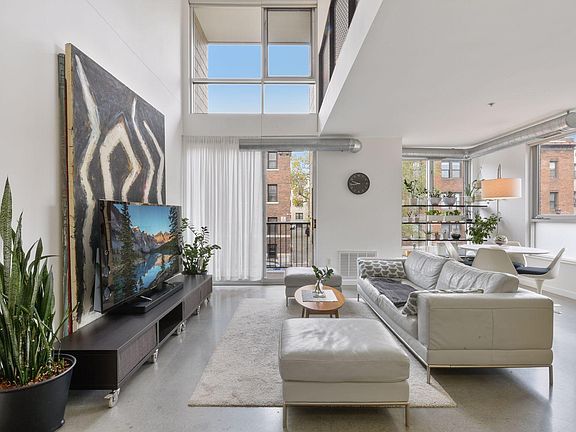 Stunning corner two story loft with 18 ft ceilings! Floor to ceiling windows create a natural sunfilled space during the day and dramatic downtown views at night. This unit features concrete floors, a guest bath, main floor laundry, balcony, upper level bedroom, flex room and plenty of closet space. The kitchen features quartz countertops, a large undermount sink, and newer stainless steel appliances. Two tandem parking spaces in the heated garage. The upper level offers a bedroom, flex room, full bath, a walk in closet and a freestanding closet. Amenities; exercise room/outdoor gather area/conference room/secured building/elevators/cable & fiber optic internet. Solar panels on roof.