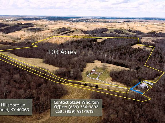 103 acre farm -- Brick home w/ full basement -- Only 10 minutes to Bluegrass Parkway, Exit #42. 1829 Hillsboro Lane --- Springfield, KY. (45 min to Louisville or Lexington) 103-acre Farm (selling as a whole) with a 27 yr. old brick, ranch home featuring a full, walkout basement. Adjacent to the house is a 30' X 50' detached metal garage/building. The 1st floor features: 3 bedrooms, 2 bathrooms as well as a vaulted, great room (complete with a real wood burning fireplace/chimney- w/ LP gas logs in place), a dining area, a very nice kitchen that has a dining/gathering/service island. All kitchen appliances can remain. Just off the great room is a very spacious mudroom/laundry/service room that leads to a 1 car attached garage. You'll appreciate the functionality of the first floor. The poured concrete basement offers over 1,800 sq. ft. of climate-controlled space (not finished), plenty of natural light (walk-out) as well as another full bathroom. Homesteads like this, "selling as a whole", are quite rare in today's market. There's a nice lake nestled in a hollow near the home AND in the center of the farm is a Long Lick Creek. ***This property offers world-class whitetail deer and eastern wild turkey hunting/habitat !! The boundary of the farm is fenced (and in decent condition). 65% of the farm is woodland and 35% is either pasture or bottomland. An exceptional offering @ $795,000 for everything !!! Call 859/481-1618 for details or to arrange a viewing.