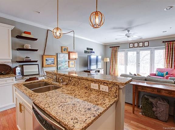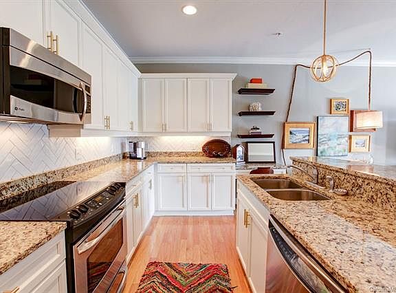 Nestled in the heat of Dilworth, this fully updated condo is walkable to all that East Blvd has to offer. An open and functional layout allows you to maximize the space within this second story unit, which features a spacious living area, crown molding, stainless steel appliances, new pendant lights, upgraded herringbone tiled kitchen backsplash, and under-cabinet lighting. Enjoy the morning sunshine, a cup of coffee, and evening drinks on the East facing walkout covered balcony which overlooks the community trees. The ample storage/closet space in the master bedroom are compliments of the dual closet organization system from Closets by Design. Dog lovers delight with easy access to the onsite dog park, and secured covered parking near the elevator makes the trip to/from your car a breeze. Secure building with key-fob entry. Make this trendy condo yours while you can - won't last long! (Note: Number of rental units in building is less than 50%. No issues with Conventional Financing)