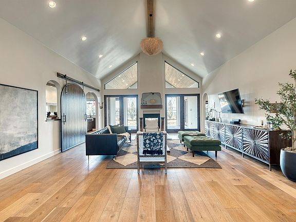 Newer Custom One-Level Home in Eagle's Prestigious Williamson River Ranch Sub along side the Boise River located in the heart of Eagle on PRIME PRIVATE WATERFRONT SETTING. Dramatic entry looking onto open soaring 16' wood beamed accented ceiling into wall of glass overlooking water and sunsets w/2-sided fireplace. Entertaining designer kitchen features 10' island, double ovens, large pantry, wood accent beams and pass through window to outside heated dining. All ensuite bedrooms & den (or 4th Bedroom) w/elegant guest bath. Spa like Master & Bath w/2-sided fireplace. Four wood 8' French doors to outside living oasis complete w/Built-in BBQ, Spa, Rock features to water, outdoor firepit covered patios & fireplace. Deluxe mud/laundry room w/built-ins, sink & storage w/Dutch door. Oversized garage w/10' tall 3rd bay door. Walk/ride miles of Greenbelt; minutes to restaurants, park, fishing or downtown Eagle. Resort-like pool, clubhouse, waterfalls & walking paths. Minutes to downtown Boise, Airport, Hospitals.