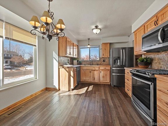 Lovely ranch home in an amazing neighborhood! This beautiful home offers a thoughtfully designed floor plan with large windows and lots of natural light. As you walk in the front door, you will immediately notice the warmth of the paved river stone floor in the foyer, the wooden doors and trim in the kitchen, along with the wood-look vinyl plank flooring. The hickory cabinets, stone backsplash, stainless steel appliances and 5-burner gas stove make this dine-in kitchen feel luxurious. Next, you will find the living room, complete with a wood burning fireplace and large sliding glass doors that open to a spacious back patio. Adjacent to this, you will find a bedroom that also features sliding glass doors to the same patio. Walking down the hall from here, you will discover the primary bedroom, complete with its own 3/4 bathroom with walk-in shower and walk-in closet, two more bedrooms and a full shared bathroom. Downstairs, you are greeted by a large finished room that you can use as a family room, game room, or anything you choose. You will also find a 3/4 bathroom combined with the laundry room. 2 car attached finished garaged, 2 sheds and RV Parking! This gem backs to Arrowhead Park and is part of the Smoky Hill HOA that includes great amenities including a pool, club house and tennis courts for only $66 a year! Plus it is only a 6 minute drive to Quincy Reservoir where you can enjoy walking trails, biking, fishing, grilling and non-motorized boating. Located within walking distance to Trails West Elementary School and only a 4 minute drive to grocery stores and restaurants, this is the perfect place to call home!
