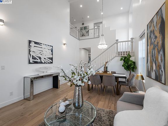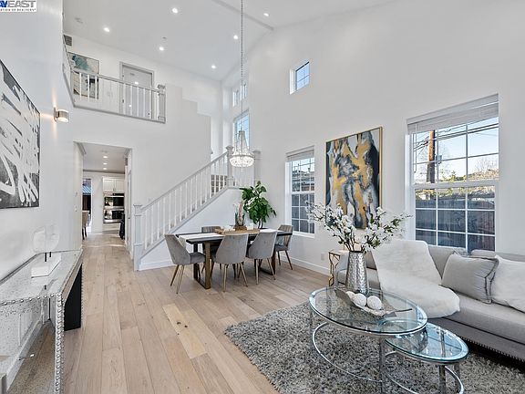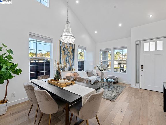Experience luxury living in this stunning custom-built home in Castro Valley. Built in 2020, this east-facing property boasts 14ft high ceilings in the living room and abundance of natural light. Open floorplan make this home perfect for entertaining. The gourmet kitchen features quartz countertops, high-end stainless-steel appliances, a centered island, glass tile backsplash, soft-closed cabinets, and a breakfast nook. Step outside to a large patio and low maintenance yard with a Gazebo, perfect for hosting parties. Retreat upstairs to the luxurious master suite, complete with a spa-like jacuzzi tub, shower, dual sinks, and a large walk-in closet. Brand new engineering wood floors, carpet and fresh paint. Enjoy added convenience with built-in sound system, surveillance camera, central heat + A/C, tankless water heater, large laundry room, and security gate. Additional features include storage cabinets in the garage. Home is close to Lake Chabot Regional Park, freeway, BART, top rated schools. Eden Medical Center, charming downtown, groceries, shopping and cafes.