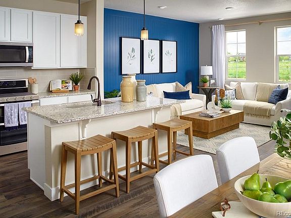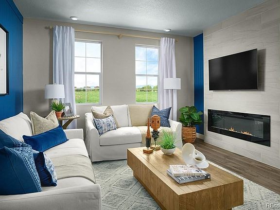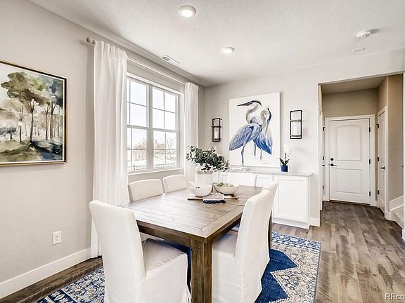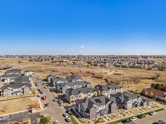 FORMER MODEL HOME WITH MOUNTAIN VIEW!!!! Brand new END UNIT townhome with private balcony off the primary suite! MOVE IN READY! Never lived in!!! High end designer upgrades!!! Contemporary Farmhouse Exterior, 2 car ATTACHED GARAGE! 3 bedrooms, 3 bathrooms, desirable open floor plan living on the main floor. Covered front porch, front entry with coat closet and fully open kitchen, dining and great room. Stunning kitchen with large island and breakfast bar seating. Main floor powder bath at the back of the home next to garage entry and another coat closet for storage. Upstairs, you will enjoy a convenient second floor laundry room next to all the bedrooms. Primary suite at one end with en-suite 5 piece bathroom with dual vanity, soaking tub, walk-in shower, linen closet, private water closet, and spacious walk-in closet! PLUS, private deck with sliding glass door to enjoy your mornings and sunsets. Two additional bedrooms at the other wing upstairs with large windows and one bedroom with walk-in closet and access to hallway full bathroom. Luxurious upgrades throughout this home include; gas range, fireplace in the great room with tile surround, prewire for ceiling fan in all bedrooms and great room, open stair railing, smart home connection, luxury vinyl plank flooring, single bowl under-mount kitchen sink, nickel hardware and satin nickel lighting, pendant lighting over the kitchen island, 2 inch faux white blinds throughout, and MORE! Enjoy easy access to Boulder or Downtown Denver! Lovely Erie small-town charm! Minutes to dining and entertainment PLUS, access to the Erie Commons outdoor pool and clubhouse. Lehigh Park, which has a playground, splash pad and Bar-B-Q grills. This community offers easy access to miles of trails along Coal Creek. Accredited St. Vrain Valley Public School District ranked in the top 25 districts for Colorado. **Seller is offering a $20,000 lender incentive**
