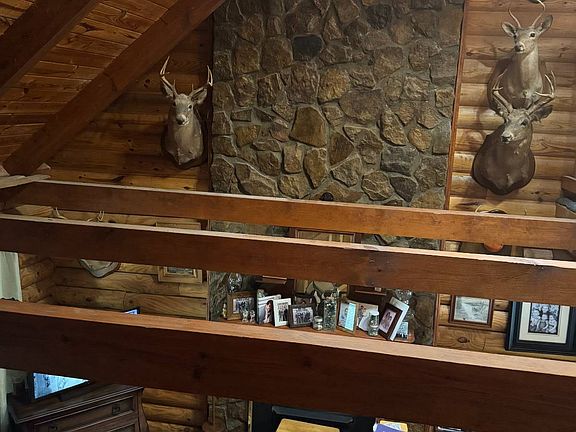 Log cabin-style homeLarge covered porchTwo-car covered pole barnAdditional shower areaCozy conventional stone fireplaceTwo bedrooms