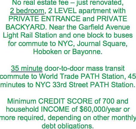 Large, 800 Square Foot 1 Bedroom with Bonus Room or 2nd Bedroom No Real Estate Fee * Private Backyard * Just Renovated * 2 Floors * Private Entrance Minimum CREDIT SCORE of 700 and household INCOME of $60,000/year or more required, depending on other monthly debt obligations. Utilities are separate. First month's rent and 1.5 months security deposit due at lease signing. Near the Garfield Avenue Light Rail Station and one block to buses for commute to NYC, Journal Square, Hoboken or Bayonne. The home features private front entrance, 3 large rooms for flexible use, 1 bathroom, stainless kitchen with microwave and a small private backyard. Three blocks to Garfield Avenue Light Rail station, Berry Lane Park and steps to bus routes 6 and 81L for commuting to NYC or Newark bound PATH, Journal Square or Bayonne. 2.5 miles to the Holland tunnel and 1 mile to New Jersey Turnpike. Blocks to the Light Rail Cafe, Hooked JC and Factory restaurants. 10 minute walk to Harry's Daughter, Pinwheel Garden restaurants and Mordi's Sandwich shop.