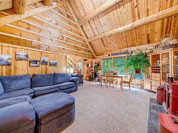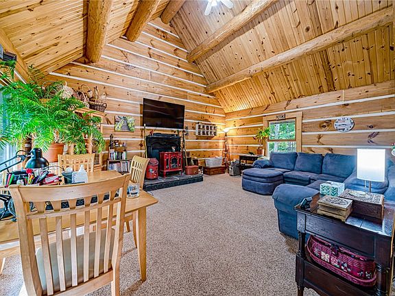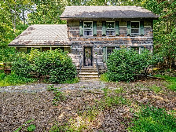 Welcome to your private haven where privacy and nature converge. Escape daily to your beautiful cedar log home/cabin privately tucked away on a 1/2 +/- acre lot that's kept in its natural state. Step inside to the main living area that's drenched in natural light from a wall of windows and further crowned with a vaulted ceiling. Snuggle up and be cozy during the colder months w/your warm, propane fireplace. The eat-in kitchen offers ample storage and direct access to the back deck -- a plus for entertaining. The main level hosts a laundry area, a nice sized bedroom adjoined with a full-bath w/walk-in shower. Journey up the stairs to discover two additional bedrooms and an additional full-bath with tub. The 3rd floor bedroom offers an excellent opportunity to use as-is or make it your own bonus/flex/storage space. The back deck (2022) is perfect for enjoying your morning coffee, a BBQ, or simply relaxing.