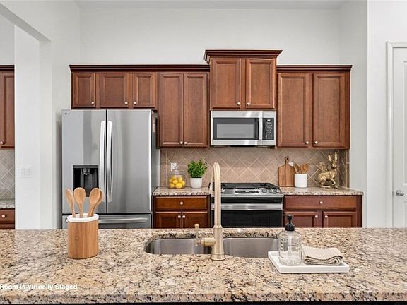 - Features: Cabinets Stain, Kitchen Island, Stone Counters, View to Family Room