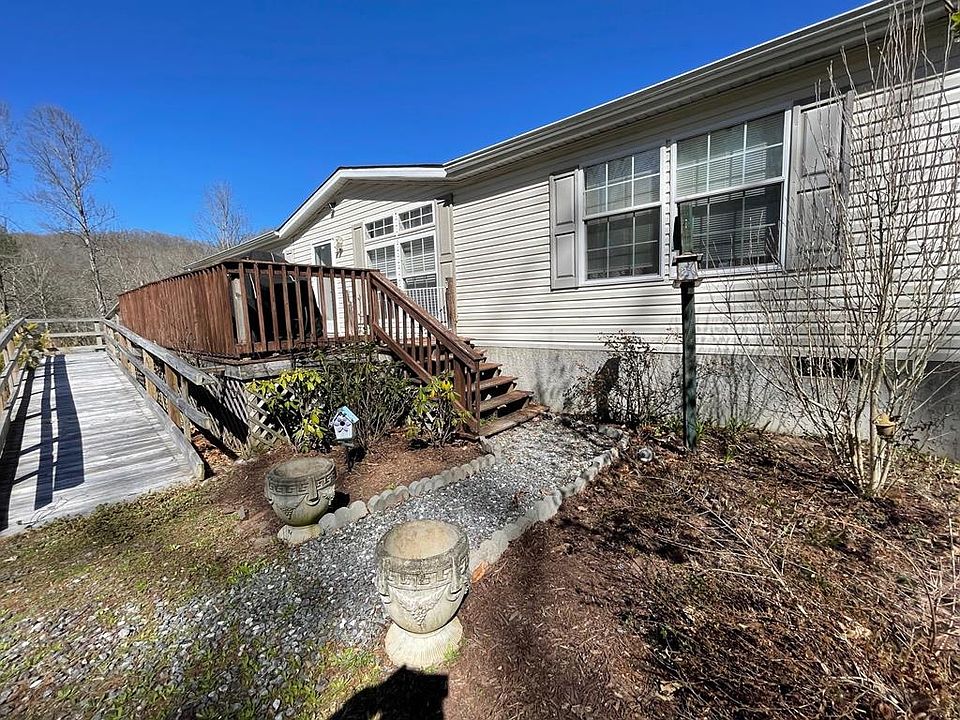 CLOSE to WCU (3.5 miles). Lovely 3 bedroom 2 bath double-wide mobile home with both a living room AND a family room. Neutral colors. The kitchen is so pretty! Fireplace in the family room! Heat pump for heat and central air was installed in 2018. A beautiful pine forest is the view from the living room picture windows. HANDICAP RAMP leads to the front deck! In the back there is a covered deck with distant views of the surrounding mountains. Easy to maintain outdoors. There is plenty of fencing around the FLAT lawn. Parking area is huge and certainly wide enough to add a detached garage one day. Nice storage shed! The drive to and from the University is delightfully pleasing with its pastures, old barns, and mountain views.