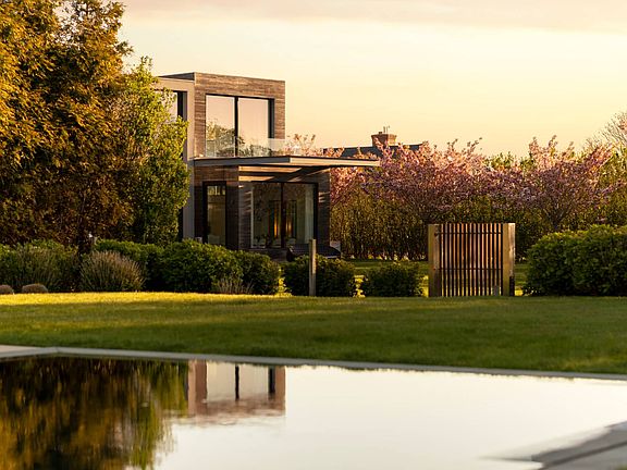 private acres. Custom build in 2013, this chic residence features seven spacious bedrooms and seven+ baths. This modern masterpiece was designed by Francis D'haene of the award winning architectural firm D'apostrophe Design. Enter into breathtaking light-filled living space graced by walls of glass through a dramatic double-height entryway with a travertine floating staircase and solid white oak floors. This home includes an 68' heated gunite infinity pool, pool house, outdoor shower and full outdoor dining/kitchen area. The ultimate setting for entertaining and enjoyment. 183 Daniels Lane makes a grand statement of elegance while affording contemporary comfort.