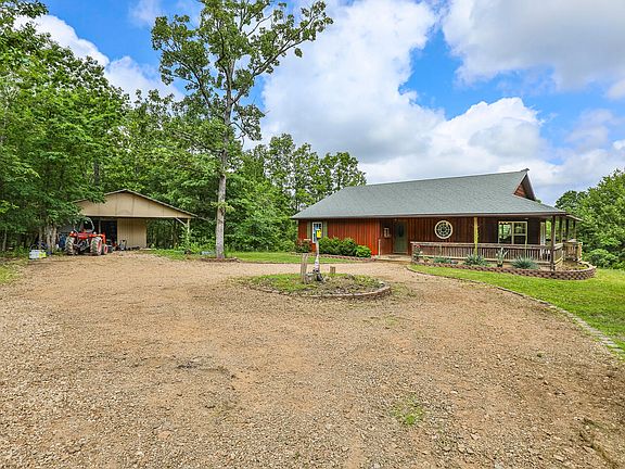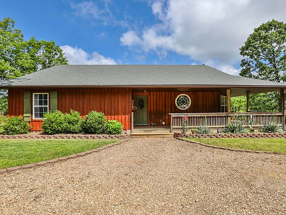 The long driveway through the woods of this 4.85 acre property will give you all the privacy you've ever wanted. The covered front porch, which wraps around the side of the home, welcomes you to this cedar-sided open floorplan home. Walk in and you'll notice beautiful features such as the high vaulted ceilings, lovely stone fireplace, and the most beautiful kitchen window. Kitchen offers a functional layout, large center island with seating for 4. Kitchen also has an ultra luxe reverse osmosis water purifying system for the best tasting water. Adjacent to the kitchen is a huge walk-in pantry, a canner's dream come true! As you head into the living room, your eyes will be immediately drawn to the wood burning fireplace & oversized windows. Three bedrooms on the main level. The primary suite has a large walk-in closet and oversized bathroom with dual vanities and tile shower/jetted tub. Head downstairs and discover a completely separate living area, One half of the basement has a living room, full-sized kitchen, large bedroom, and full bathroom. Range & microwave are included., as well as existing plumbing for a stackable washer/dryer (not included). The other half of the basement has 2 bedrooms ( both non-conforming), mechanical room, & large storm shelter with steel door, concrete walls & ceiling & lots of storage space. With both inside & outside access, this versatile level makes the perfect place for hosting large gatherings, overnight guests, or even an income-producing vacation rental. Outside you'll love the spacious brick patio, raised beds, and garden area off the lower level. Property also has a couple of outbuildings for all your tools & equipment, and a treehouse for kids of all ages. Come take a look!