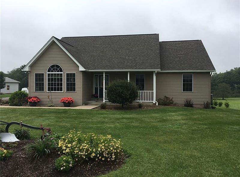 1700 sq ft pristine & quality built 1 level home, separate entry into planked cathedral ceiling living room to convenient dining area & finally the well lit friendly kitchen, boasting ample oak cabinets, Corian counter & Acagia floor. 1st floor laundry, Pella windows, 6 panel doors, and all will like the large master bedroom, walk in closets, roomy 4 piece bath, double sinks, shower & Jacuzzi tub. Almost no steps. The finished 1400 sq ft like new walkout lower level with high ceilings & great room atmosphere, family room, exercise area, guest bedroom & 3rd full bath. Composite front decking, silent trust flooring, Manifold Pex water system, low heating bills, and attractive & landscaped rear access to lower level. Double lane paved drive. 2 stall attached garage & 27' x 37' detached garage with heated floor, powder room, and extra electric for workshop or hobbies. Franklin Twp, Slippery Rock School, short drive to Rt 422 and I-79. 10 minutes to Moraine State Park.