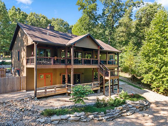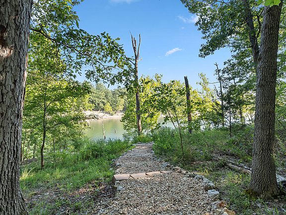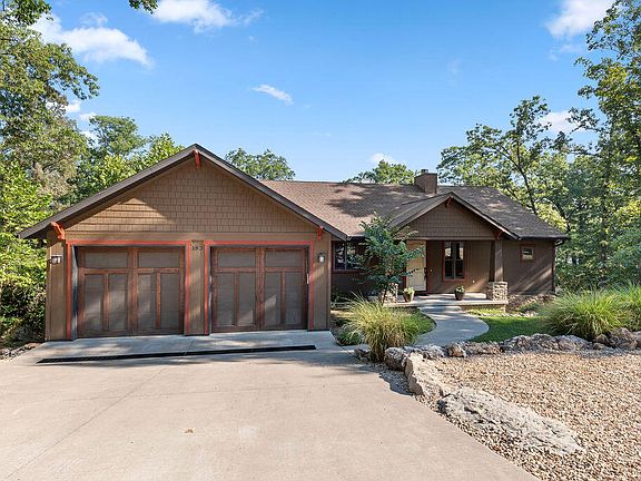 Elegant and rustic lake house with spectacular deck, walk to water access and boat slip. Walk into a cozy and beautifully finished open concept great room with vaulted wood ceiling, wood-burning stone fireplace, and custom built-in shelves. Oversized 9' windows allow a wide-open view to deck & lake; wood, stone, and tile give this lake home the perfect warm, cabin vibe. The spacious covered deck is perfect for 2 to lounge or a BBQ for a crowd! An open kitchen with custom cabinets has stainless steel appliances, granite countertops, and lots of storage. The main level includes the primary bedroom/bath with large walk-in shower, and abundant closet space, plus an add'l bedroom suite, and the laundry/mudroom. Downstairs is a large family room with wet bar, another large lake deck, and two bedroom suites, including the Bunk Room which sleeps 6! This beautiful house has abundant charm and good looks, plenty of space for family and guests, lots of storage, and over 1300 sq ft of covered deck/porch. A two car garage is on the main level, and a 3rd garage is accessed from the back. The 9x28 boat slip is 300' down the road, for $50,000. Located in the private Eagles Point neighborhood, on the quiet side of Table Rock Lake, just 15 minutes to Shell Knob, and 40 minutes to Eureka Springs.