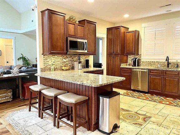 5 years new! Ranch style living, walking distance to the beach, and over 30 above sea level. This home with beautiful short leaf Acacia wood floors offers 4 bedrooms, 3.5 bath, large kitchen, and a private office on the first floor! Home was designed with 2 large master suites. One suite is located on the first floor, and the other is the finished room over garage (FROG) which includes a kitchenette and living/media room to boot. Ground floor master includes luxury shower with marble tile and a spa-like pebble floor. Rooms and bonus spaces easily adapt to your needs such as workout, dining, office, craft area etc. Smart home/remote-ready systems including HVAC, plumbing, lights, pool, security, and irrigation. Thoughtful enhancements and upgrades throughout such as Kohler tubs, solid doors, wide decorative molding, oil rubbed bronze hardware, skylight - even top quality spray foam insulation keeping noise levels to a minimum and your energy bills more efficient. Adjust your ambiance with multiple lighting options including canned lights, sconces and under-cabinet lights. TONS of storage and closet space. Large kitchen with tons of cabinet space and pantry to accommodate oversized cookware. Large garage with two 8' tall garage doors and 12' ceilings to handle even more storage and SUV parking needs a small boat would fit easily as well (bring it around the corner to one of the community accesses and cruise out on the sound!) Landscaped with meticulously maintained Centipede turf and finished walkways/sidewalks around the perimeter of the home. Fenced-in backyard with saltwater pool strategically placed to get sun all day long. Private, quiet and no thru-traffic in this cul-de-sac location. Multiple walking paths nearby offer easy access to beach, grocery, Walmart, Home Depot stores and close by medical services.