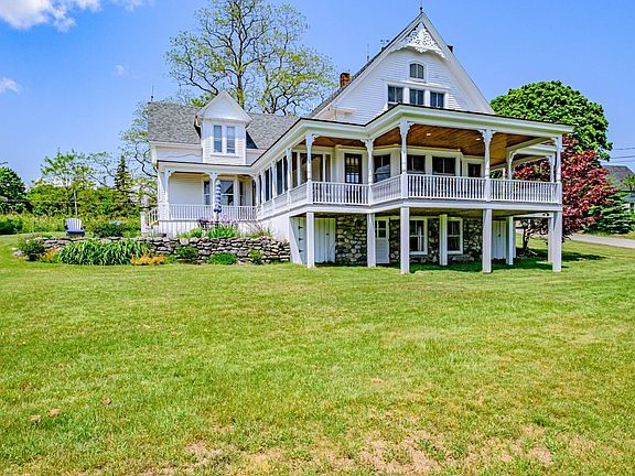 1840 and a 2008 renovation kept much of the original charm and details—like the decorative eaves and gables, or hardwood and tiled floors throughout—while updating the home for modern comfort. The first floor has a large entryway, a living room with wood stove, a dining room, and a bright kitchen that perfectly blends the old and the new with charming antique cabinets paired with updated floors