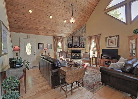 This beautifully landscaped mountain home is one of the most inviting homes in the North Ga. Mountains. It screams comfort from the front porch to the elegance of the great room with T&G ceilings and stone fireplace. Loaded kitchen with large island seating, glass door cabinetry, granite countertops, and tile back splash. Three bedrooms and three extra nice baths. Maple floors and architectural features add to the beauty of home. Walk out finished basement feels like most cabins main level with natural lighting and wonderful deck. Large office space. Three levels of decks for outdoor living and enjoying the gardens. Two car garage with super workshop. New CHA. Garden shed. Pictures do not do this lovely home justice.
