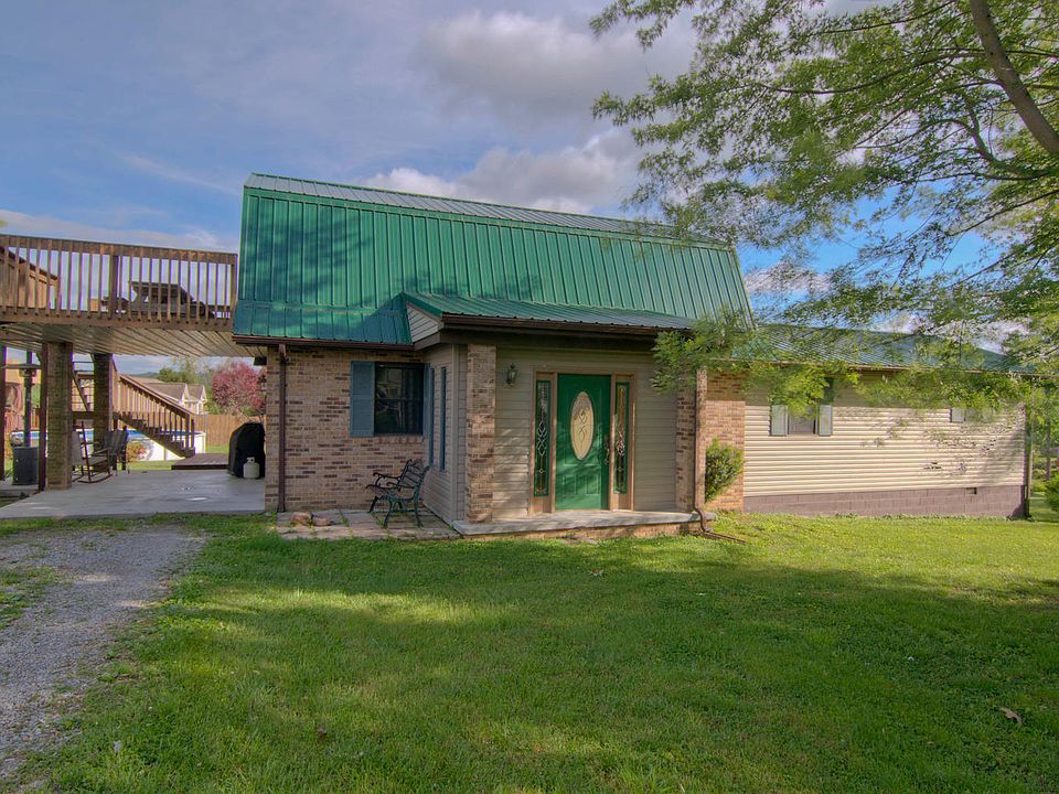 new metal roof, new wood cabinets, new counter top, new appliances, stacked stone back splash, tile in mud room, natural gas hook up, large living room with ceiling fan, addition in 2000 including master bedroom, large closet, door to deck, whirlpool tub, stand up shower, 2 bedrooms and full bath upstairs, ceiling fans, door to side deck, above ground pool with new liner and large deck