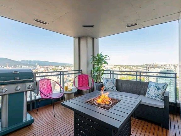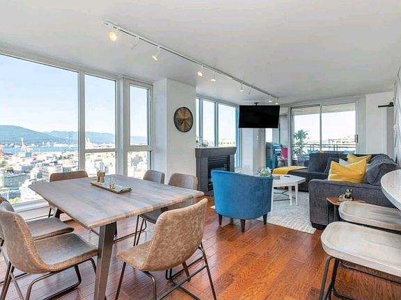 Million-Dollar Views in the Heart of Vancouver! Enjoy breathtaking 260° panoramic views of city skylines, Northshore Mountains & Burrard Inlet. Short term rental allowed! It's both a luxurious residence and a rare investment opportunity. Inside, floor-to-ceiling windows flood every room with light. The open-concept design features engineered hardwood throughout with abundant storage, seamless flow, and elegant finishes perfect for entertaining. A large 2 bed 2 bath + den CORNER unit with covered patio, this home offers comfort and style. Amenities include: indoor pool, hot tub, sauna, fitness centre, games room, private gardens, and on-site caretaker. Save on utilities with heat, hot water, and gas fireplace included in strata fee! Just steps from SkyTrain, Costco, T&T, and vibrant dining!