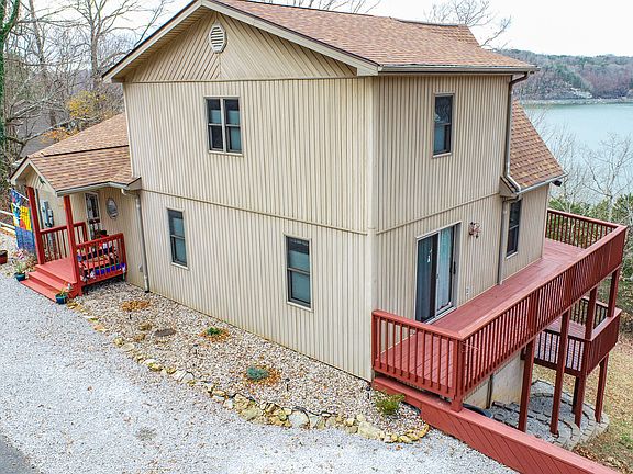 This nice lake front home was built in 2001 and contains over 2,500 square feet of living space, along with an attached 2 car garage and large storage room under the lower-level deck. On the main level you will find an open concept living space. The eat in kitchen has seating for 5 at the island which has a lovely 2 level, tile countertop with custom inlaid designs. This kitchen also has custom built oak cabinets, with a large pantry area with pull out shelving. Two large windows behind the kitchen sink with a nice view of the lake makes washing dishes that much nicer. There is also a large area for a dining table with 6 chairs, and all is open to the living room with vaulted ceilings and a full glass view of Lake Cumberland.. Enjoy your walk around deck with that incredible year round view of Lake Cumberland, that is accessed just off the kitchen, perfect for grilling out. Both upper and lower decks are connected on one end making it perfect for entertaining. Also on the main level is a large utility room with washer, dryer, and utility sink. Just off the living room there are 2 bedrooms, one having a sliding glass door to the deck on the side of the home and a full bath to be shared. The master bedroom is upstairs in an open loft area allowing that incredible lake view to be seen from there thru windows in the vaulted ceilings in the living room. In the master bedroom there is an en-suite bath with large, jetted tub and separate shower. His and hers double closets are also in the master suite.