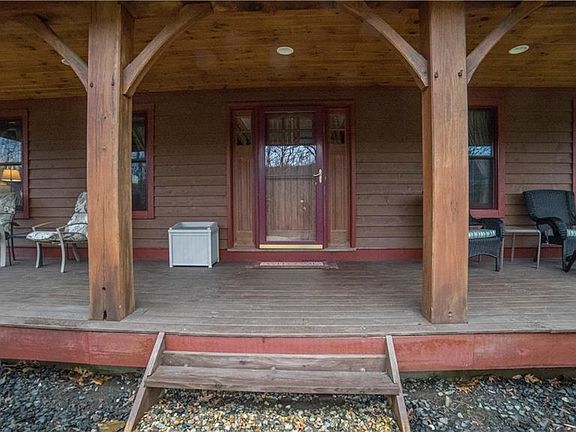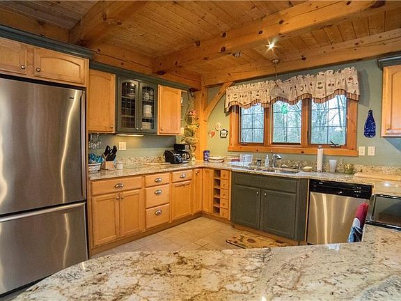 Unique , Timber Frame Home, Energy Efficient, 4 Bedroom Cape, Open Floor Plan, Craftsman Style features. 1st flr Master including two walk-in closets, hardwood floors, master bath with deep soaking tub, shower stall ,tile floor and nice vanity. Kitchen ,granite counters, SS appliances, breakfast bar, maple cabinets. Radiant hot water heat on first floor and in large finished lower level family room with plenty of storage, Living room with vaulted ceiling and propane stove. Main level mudroom/laundry with sink & tile floor. Upstairs hosts an open loft, big full bath with nice vanity, and three bedrooms all with vaulted timber ceilings. Enjoy relaxing on your large front porch or your backyard patio admiring your 1.75 Acres. Two car garage and large shed also accompany this lovely, well maintained home. This is what country living is about