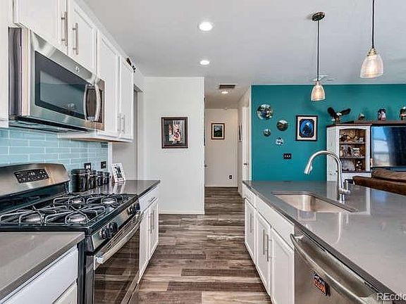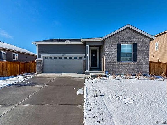 This specific home has an abundance of upgrades through out, such as, upgraded kitchen with quartz countertops, huge island or breakfast bar, stainless steel appliances, walk-in pantry, upgraded lighting, large slider door to backyard, beautiful high end laminate wood floors and freshly painted accent walls. Great room has been prewired 5.1 for theatre. Master bedroom is a nice, roomy size with a walk-in closet; adjoining the master bedroom is an upgraded master bathroom with tile floors, double sinks, quartz countertops, and an oversized shower. Be sure to notice the dramatic 8 ft. doors through out the home. Seller recently added decorative brick walkway from driveway around to backyard where a convenient brick patio was constructed. The garage has been neatly finished with insulation, dry walled and smartly painted. This is a MOVE RIGHT-IN home!!!!Be sure to set an appointment to see this SUPER CLEAN, comfortable 3 bedroom, 2 full bathroom home in a convenient location near E470, I-70 and DIA.