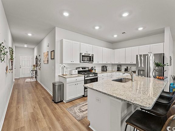 This beautiful, water front home, nestled East of bypass 17, will certainly check of lot of boxes. From the laminate flooring, stainless steel appliances, granite counters, added back porch and fenced in yard, this home creates a small oasis for those wanting to be a very short drive to the beach. The current owners take weekly rides to the beach via golf cart. The cart would also be available for purchase. Also, washer and dryer can be bought. Don't miss out on this beautiful home. ***Current owners are moving out of town but must occupy the home until June 21st. A short-term lease back is an option for those wanting to purchase before***
