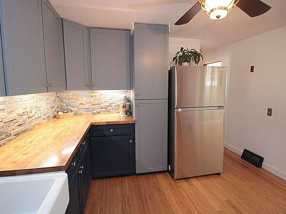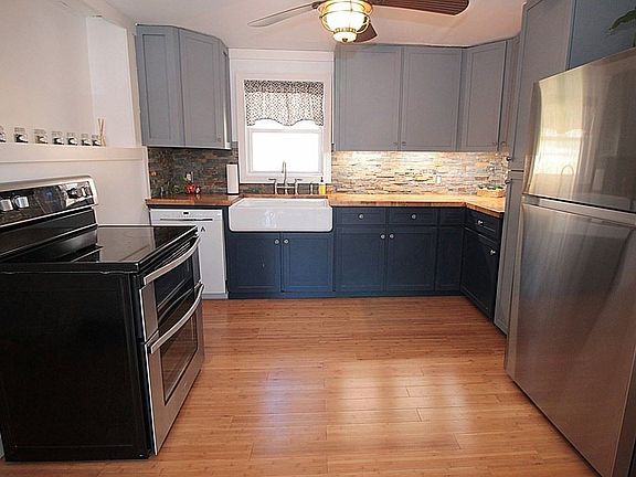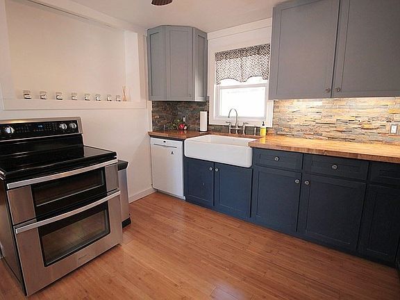 YOU WILL NOT WANT TO MISS THIS ADORABLE AND AFFORDABLE RANCH! This home offers a gorgeous remodeled kitchen with butcher block countertops, stone back splash, custom cabinets with self close drawers, farmhouse sink, newer stainless steel refrigerator/stove and light bamboo flooring that continues into to formal dining room; Full updated bathroom with tile flooring/tub surround and tasteful fixtures; Loads of polished hardwood flooring throughout; Spacious living and family rooms with brick faced fireplace and access to oversized front patio and Trex back deck which allows for panoramic views of the stunning lot-complete with tiered gardens and retaining wall; Extra wide garage with double driveway; partially finished basement for additional storage and living space; Additional upgrades include architectural shingled roof (2015); circuit breakers, and some vinyl replacement windows-WELCOME HOME!