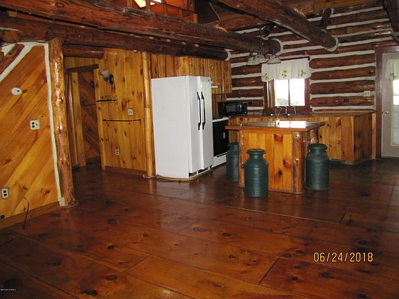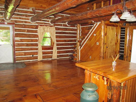 27.27 acres, very private, custom log home; approx. 1,586 sq ft. living space, 4 BR, 1 FB, open fl. plan, loft bedroom, cathedral ceiling, 2 BR main level, wide plank flooring, partially finished basement w/bedroom/office/playroom/laundry & utilities. Screened porch overlooking ADK Mtns., entry porch, outdoor wood furnace, double 275 g. oil tanks, above ground pool w/deck. If privacy is what you are looking for this home is for you! Private road.
