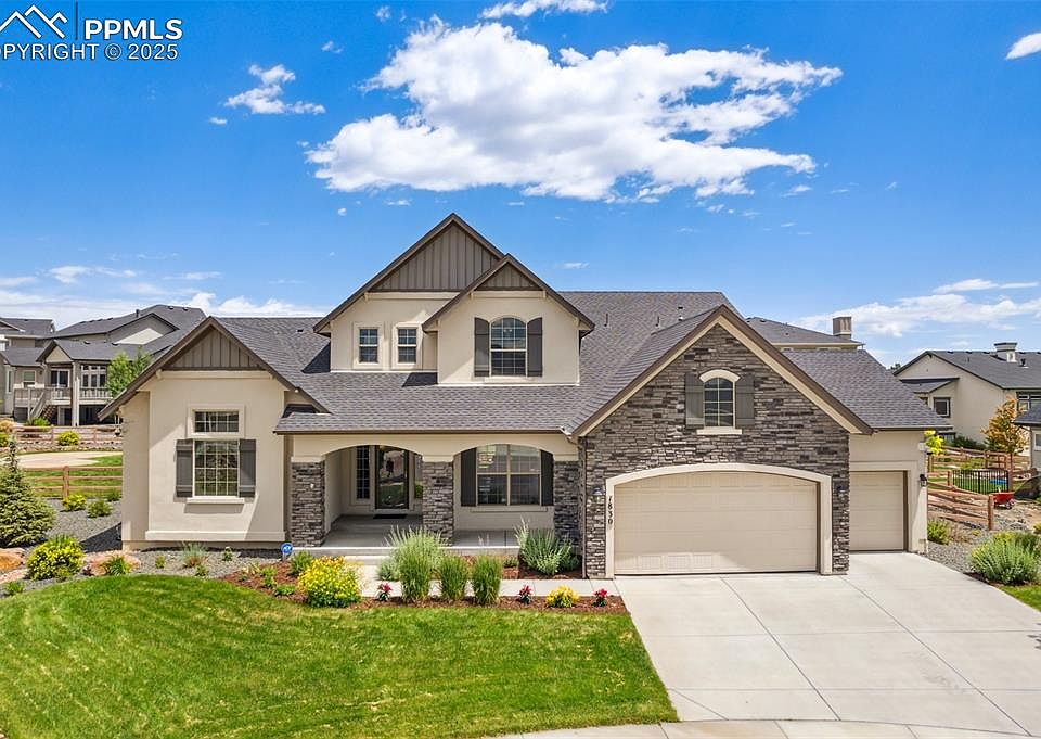 Nestled in a quiet cul-de-sac in the heart of Flying Horse, this gorgeous two-story stucco home offers the epitome of elegant, yet relaxed Colorado living with main level convenience. As you enter, you will be greeted by an abundance of natural light which flows into the great room through floor to ceiling windows. The tastefully designed floor plan features ample living space across the main floor, including a massive living room, cozy family room with a fireplace, formal dining, gorgeous gourmet kitchen and a luxurious primary suite. This gourmet chef's kitchen features top-of-the-line appliances including a gas cooktop, double ovens, pot filler, large center island, subzero refrigerator, slab granite counters, upgraded cabinets, beautiful engineered wood flooring, and is adjacent to the spacious formal dining room. Retreat to the tranquil main level primary suite, complete with a spa-like ensuite bathroom featuring dual vanities, a soaking tub, a huge walk-in shower with rain shower head, and two walk-in closets while the laundry room is tucked away just around the corner for added convenience. The recently finished basement features two additional bedrooms adjoined by a Jack-and-Jill bathroom with penny floors, as well as an expansive family room, perfect for all kinds of activities! With one of the biggest back yards in the neighborhood, you will find your oasis for relaxation or entertainment awaits, featuring one covered patio ideal for outdoor dining or lounging and another separate concrete patio area perfect for a firepit, hot tub, etc. New cement fencing adds privacy to the backyard oasis. An attached 3-car garage offers ample storage and convenience. The sought-after Flying Horse offers wonderful amenities and easy access to I-25, the Air Force Academy, D-20 school, and recreation. Schedule a showing to see this magnificently upgraded home today!