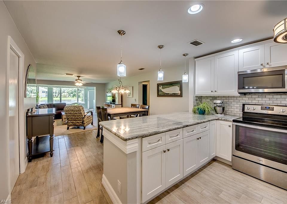 This beautiful condo is a first floor end-unit with a lake view! Rarely on the market, this 55+ community is centrally located in Fort Myers, close to beaches, the airport, and shopping. Enter to new wood plank tile and a remodeled kitchen that opens to dining. New cabinets, granite, and stainless steel appliances. The newly remodeled master bathroom has a walk-in shower for easy access. Relax in your Florida room while enjoying the peaceful lake view. Florida room has impact windows and door and new plank tile. The unit is furnished and move-in ready, including a motorized adjustable bed in the master. Enjoy an assigned covered parking spot, community pool, and shuffleboard court. Don't wait, schedule your showing today!