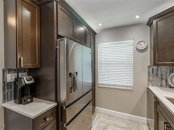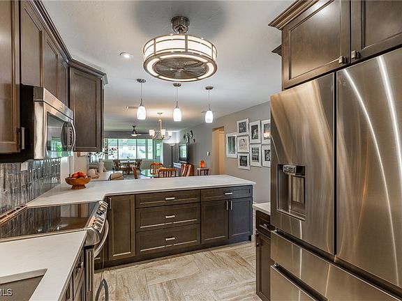 Step inside an elegantly remodeled, high-end kitchen featuring ample cabinetry, upgraded quartz countertops, and quality finishes, with upscale appliances, an inside double washer and dryer. The spacious living and dining areas flow effortlessly to the enclosed lanai, where expansive lake views create a peaceful backdrop all day long.