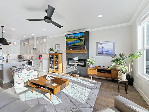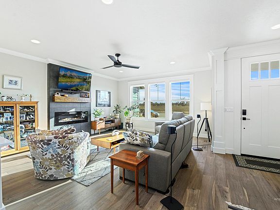Come check out this amazing luxury home in Pine 43! Amazing access to the Valley - close to the freeway, Scentsy Commons, the Village at Meridian and Blue Cross! There is a main bedroom with attached bathroom on the main level that could be an office or bedroom, as it's also zoned to have a a live/work situation (for CPA or attorney type of work). Amazing upgrades in this home: quartz counters, 5 burners gas stove, Bosch Fridge included, walk-in pantry, and tons of storage thru out! All the bathrooms are tiled with quartz, all bedrooms have ceiling fans including the loft area, upgraded Ecobee thermostat w/sensors for both levels, room darkening custom shades, and additional storage racks in the garage, this property is the only one with a balcony out front - right off the primary bedroom that makes this a true retreat. Custom shade flag recently installed makes this a place to sit all day if you like! Don't forget about the amazing community amenities - pool and sports courts along with walking paths.