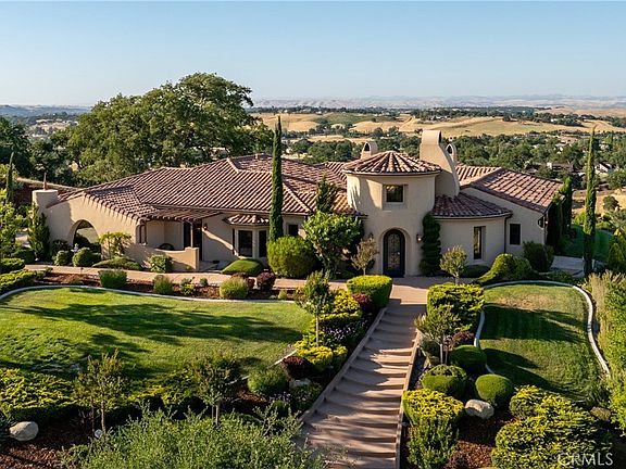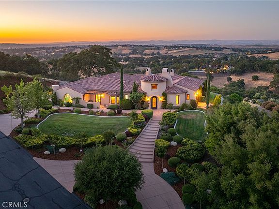 Welcome to an exquisite 4,294± sq. ft. single-level home on 1.83± acres in the highly desired gated community of Santa Ysabel Ranch Estates in Templeton. This stunning residence features 4 bedrooms, 5 bathrooms, and an attached 3-car garage. Step inside to discover exceptional finishes throughout, with newly painted interiors and refreshed landscaping enhancing its appeal. The heart of the home is the central courtyard, complete with a cozy fireplace, perfect for intimate gatherings and outdoor relaxation. Multiple outdoor living spaces and patios offer ample room for entertaining and enjoying the serene surroundings. The kitchen is a chef's dream, boasting a center island, granite countertops, intricate stonework, a six-burner Viking range, stainless steel appliances, a dining area, bar, and wine fridge. The formal dining room shares a wing with the wine cellar and butler's pantry, providing an elegant setting for hosting dinner parties. The living room and primary suite both feature elegant fireplaces, adding warmth and ambiance to these spaces. The primary suite also includes a soaking tub and custom tiled shower, creating a luxurious retreat. Vaulted ceilings and French doors throughout the home enhance the spacious and airy feel. Enjoy incredible views and ultimate privacy in this serene estate. Experience luxury living in Santa Ysabel Ranch Estates.