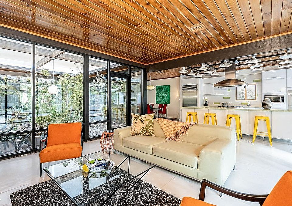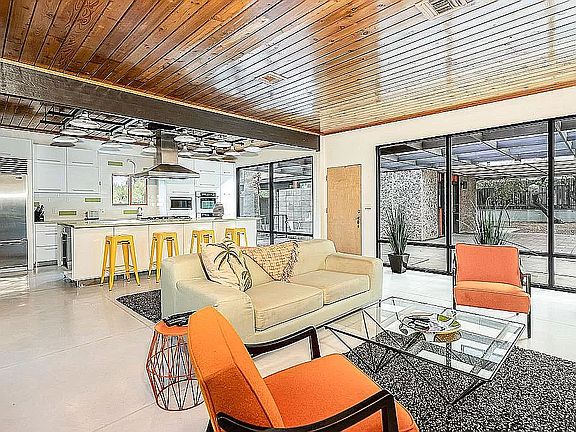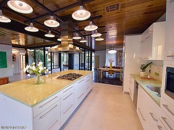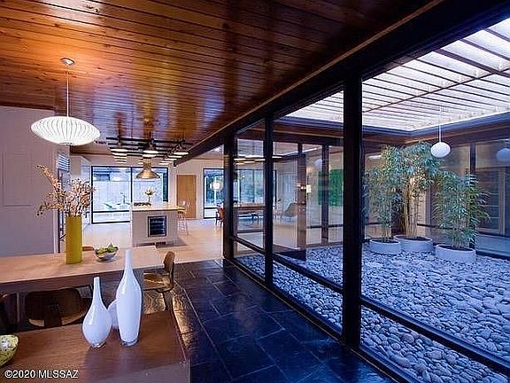 Designed by noted Tucson architect John H. Beck, AIA in 1962, this warm, sophisticated house is a superb example of midcentury desert architecture in Southern Arizona. Situated in the Blenman-Elm historic district and at the end of the exclusive and tranquil Potter Place cul-de-sac, the property features a 3,600 SF 3 BR/3.5 BA home designed around a dramatic glass atrium, with striking solid wood ceilings and floor-to-ceiling windows. Also includes a 400 SF detached office/studio and an 880 SF 2BR/1BA guest house with a large covered porch with panoramic views of the Catalina Mountains. The first time on the market, the home has been extensively restored with updated HVAC, electrical, plumbing, windows, high-end appliances, and a contemporary open kitchen with an 18-foot-long island. The restoration added a large master bedroom with en-suite bathroom and private patio overlooking the pool. Groundbreaking when it was built, the restoration has been honored with a Distinguished Building Award from the AIA. The home is listed on the National Register of Historic Places, which makes the property eligible for a significant annual reduction in State property taxes. The owner is also seeking designation as a City of Tucson Historic Landmark, a permanent rezoning that offers enhanced protections and ensures the home will retain its historic value. It is considered an honor, as only a handful of Tucson residences have been granted this status. In an early and unique use of recycled materials, the exterior walls are made of precast concrete panels embedded with rocks from the nearby Rillito River. The glass atrium serves to constantly bathe the interior spaces in Sonoran Desert light and to provide passive cooling in the summer months. The half-acre property includes a pool and extensive outdoor patios, a perfect sanctuary to entertain family and friends. Come thrive in this modern home full of light and youthful energy, within walking distance of the UA and a short drive to vibrant downtown cultural and entertainment events. Begin your evening with a short stroll for drinks at the fabulous Arizona Inn resort, then return for dinner around the pool, facing another seemingly endless – and endlessly stunning – Southwest sunset.