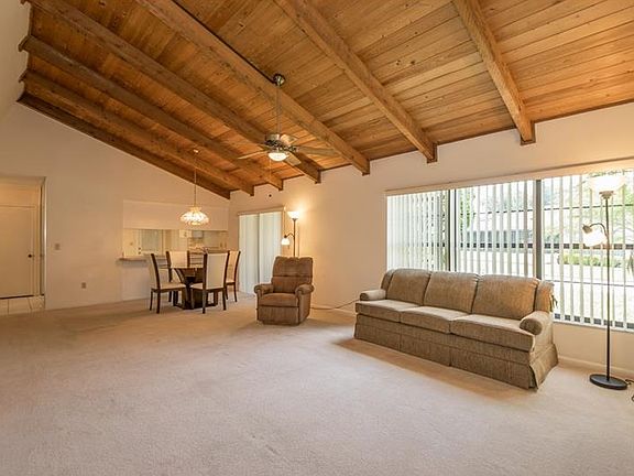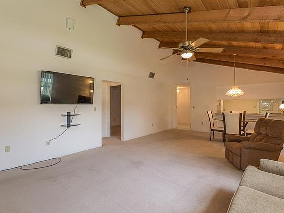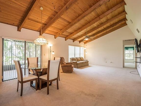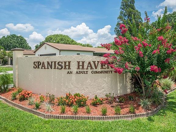 3BD/2BA HOME LOCATED IN THE DESIRABLE AND QUAINT 55+ COMMUNITY OF SPANISH HAVEN...This is the perfect Florida home for full or part-time living with 1,420 sqft of comfortable living space. Interior offers vaulted wood beam ceilings in the great room, large kitchen, dining area, split-bedroom layout and a screened outdoor lanai perfect for relaxing and entertaining. Kitchen is spacious with tile floors, 2 pantries, garage and lanai access and enough space for a kitchen dinette set. Great room is 22x15 with gorgeous wood beam ceilings, lots of natural lighting and sliders to the lanai. Master suite is nicely sized with ample closet space and en-suite full bathroom with skylight and tiled walk-in shower. Guest bedrooms are equally as comfortable with ceiling fans and easy access to the hallway guest bathroom. Screened lanai has tile flooring, ceiling fans and an eastern exposure for shaded afternoons. Two car garage with remote garage door opener, attic access and a custom screened garage door to keep the garage space clean and cool. Homeowner's association dues are only $150.00 per month and include lawn mowing, water, sewer, use of clubhouse, pool, tennis courts, and shuffleboard courts, plus maintenance on the common areas. This is a great community to call home!