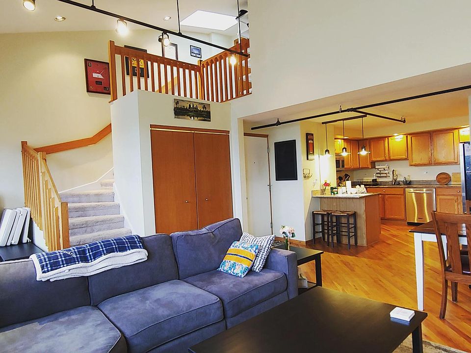 Welcome home to this sun-drenched two-story penthouse steps from downtown Evanston! The home opens up to a lofted ceiling combo dining-living space, attached to a host's dream kitchen with granite counter tops and stainless steel appliances. Great hardwood floors throughout whole first floor, including the Master, with a carpeted staircase and upstairs bedroom. Both over-sized bedrooms have great storage, en-suite bathrooms, with a bonus half bath in living space. The Master and the living room both open straight onto the 1000 sq ft west-facing porch, that is perfect for entertaining. Additional storage beneath the staircase. In-Unit Laundry. Elevator Building and a garage spot included in price! A short walk to the CTA, Metra and all that downtown Evanston has to offer. Owner pays water, sewer and trash. Tenant covers gas, electric and cable/Wi-Fi