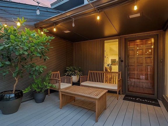 The home opens to soaring skylight-filled ceilings. The light-filled space is automatically shielded at dusk by shades that awaken at dawn. The spacious updated kitchen boasts Brazilian quartzite countertops and custom inset soft-close maple cabinetry. At the center of the home, the living room opens to accommodate gatherings with many conversational spaces, and an additional space for media, a playroom, or studio. Hardwood hickory flooring carries throughout the main living areas, grounding the modern lines with warmth.