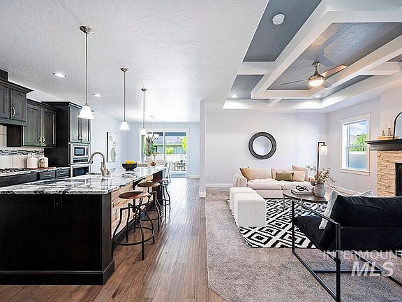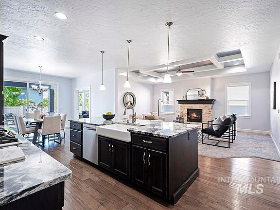 Situated in an established Meridian neighborhood steps from the community park and a short drive to local schools and shopping! Charming front courtyard leads into a spacious, versatile layout with multiple gathering spaces for entertaining and everyday living. Chef's kitchen boasts new stainless-steel appliances, gas range, large walk-in pantry and island overlooking the great room accented by a stacked stone gas fireplace and designer wood beams. Retreat to the tranquil master suite featuring tray ceilings, ensuite with dual vanities, his/hers closets and tiled walk-in shower-a private sanctuary to relax and unwind. State-of-the-art home theater is fully equipped with reclining chairs, TV/sound system, LED lights and half bath-the movie buff's dream viewing spot! Enjoy seasonal entertaining on the extended patio surrounded by easy to maintain turf, vegetation and garden boxes. Park your RV in the massive 48 x 16 RV bay with separate storage room plus additional oversized two car bay all with epoxy flooring.