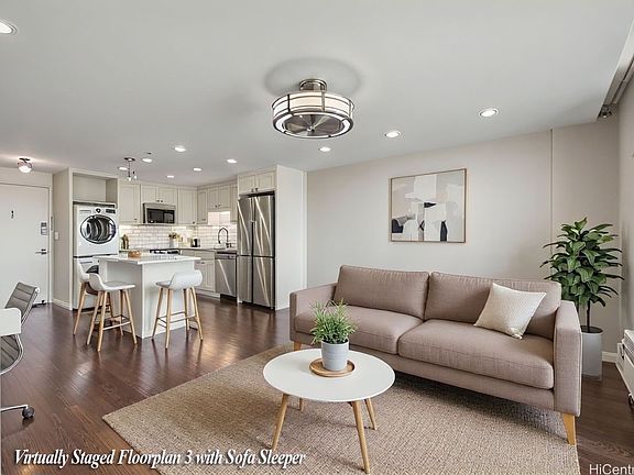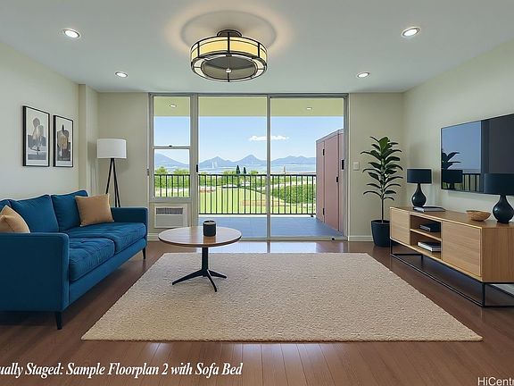 Step into the luxurious Kemoo By the Lake #810—a fully remodeled modern studio with a 98 sq ft lanai showcasing serene mountain views and postcard sunsets. This designer space features a chef-inspired kitchen with quartz countertops, subway tile walls, a River White island, & a full suite of premium stainless appliances including full-sized Haier quad-door refrigerator, Blomberg convection range, Midea dishwasher, convection oven microwave, & touchless faucet. Enjoy in-unit laundry, beautifully integrated with cabinetry and high-efficiency LG washer/dryer. The spa-quality bathroom impresses with floor-to-ceiling quartz, KOHLER cast-iron soaking tub with glass doors, double-sink vanity, LED anti-fog mirror, & premium Delta fixtures. A sleek Murphy wall bed with desk, recessed LED lighting, luxury vinyl plank flooring, air conditioning, smooth-finished walls/ceiling & smart Schlage keypad lock elevate everyday comfort.Perfectly located across from Schofield Barracks with easy freeway access—modern living, maximum convenience, and exceptional upgrades throughout. (see supplements for complete Renovation List).
