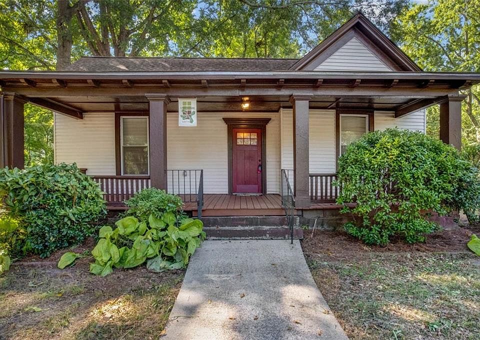 Cute bungalow in Center Park Neighborhood with a rocking chair front porch. This home has been updated and features original hardwood floors in the front (owners suite) bedroom and a decorative fireplace. The main living area has LVP flooring and a decorative fireplace in the center of the room. The kitchen features custom cabinetry, granite countertops, breakfast bar overlooking the living area & mosaic tile backsplash. The front room or owner's suite has a large walk-in closet and a private bathroom with a granite vanity top, custom tile floors and a shower. The secondary bedroom features another decorative fireplace and two closest one of which is a walk-in. Enjoy sitting on your back deck while you grill out. The yard is partially fenced and very spacious.