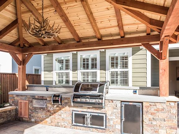 Impressive one-of-a-kind custom built outdoor living area. Hand cut and hand laid craftsman style stone work. Built-in grill and refrigerator, custom pergola with roof, antler chandelier, fire pit, beautiful landscaping, trash bin closet, custom lighting, gourmet kitchen, stainless steel appliances,breakfast bar, dining area, open floor plan, bedroom and full bath on main level that can be used as office as well, master ensuite upstairs, soaking tub, large shower, walk-in-closet, two guest bedrooms upstairs, guest bath upstairs with double vanity sinks, entire home is preplummed for a/c and custom tools cabinet in detached two car garage and coordinating floor is luxurious. Hemingway Model. This home is like no other in East Garrison. Must see!!